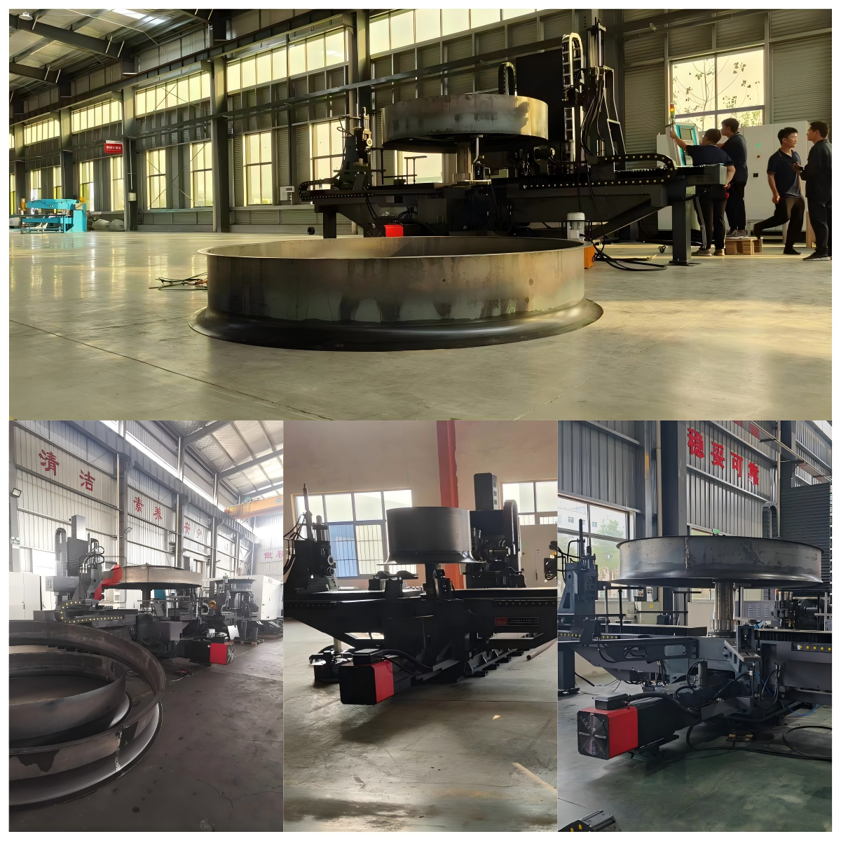 The equipment uses Siemens 828D full digital servo control system, which controls five axes at the same time. Using digital control technology, all axis feed functions are controlled by servo motors for fully automatic machining. In particular, the flipping motion abandons traditional hydraulic control and uses advanced absolute value servo motor position control. While rotational motion, the flipping spindle can move forward and backward, allowing the flange flanging forming angle to be adjusted at any angle and position within the range of 0-90 degrees through numerical operation.The bell mouth edge R≤80.